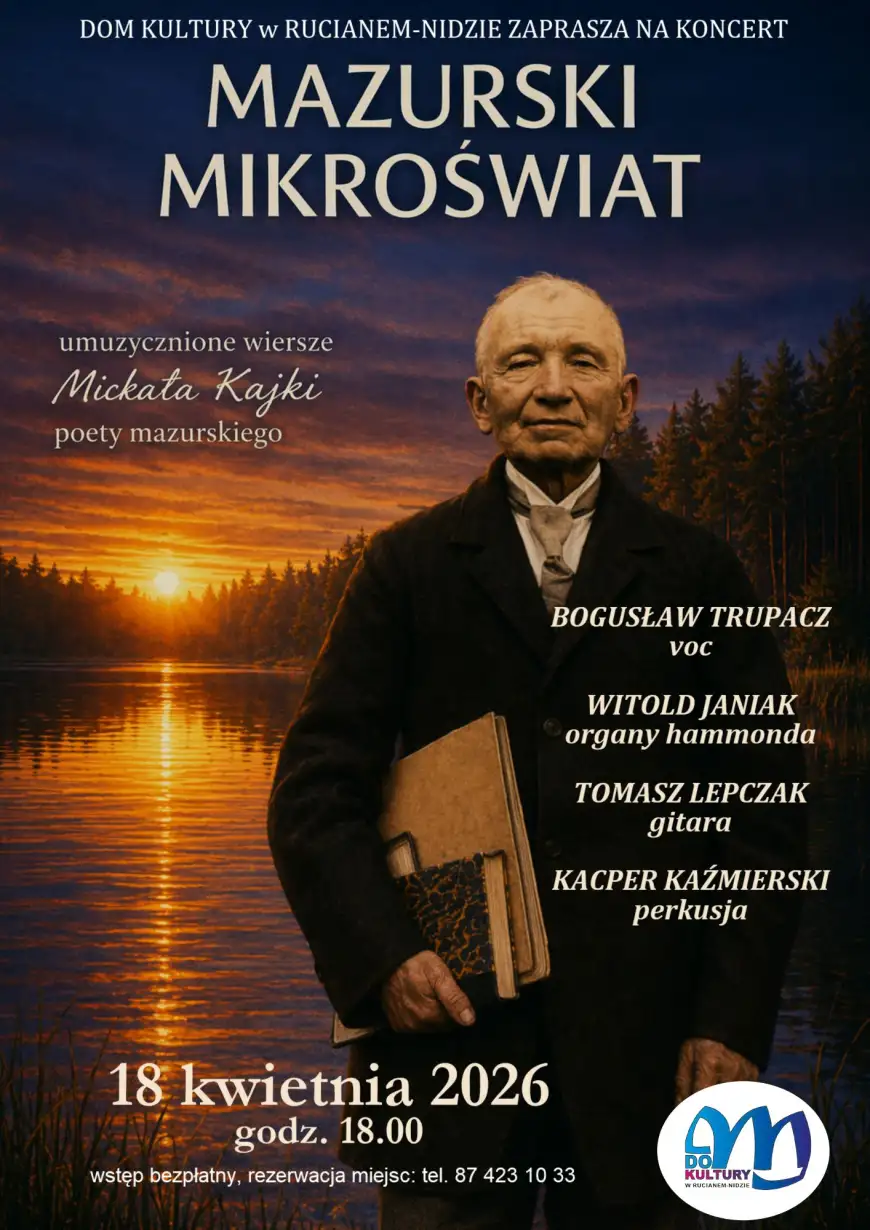 18 kwietnia b.r. zapraszamy do Dom Kultury w Rucianem-Nidzie na koncert Mazurski Mikroświat. Poezja poety mazurskiego - Michała Kajki we współczesnych aranżacjach muzycznych.